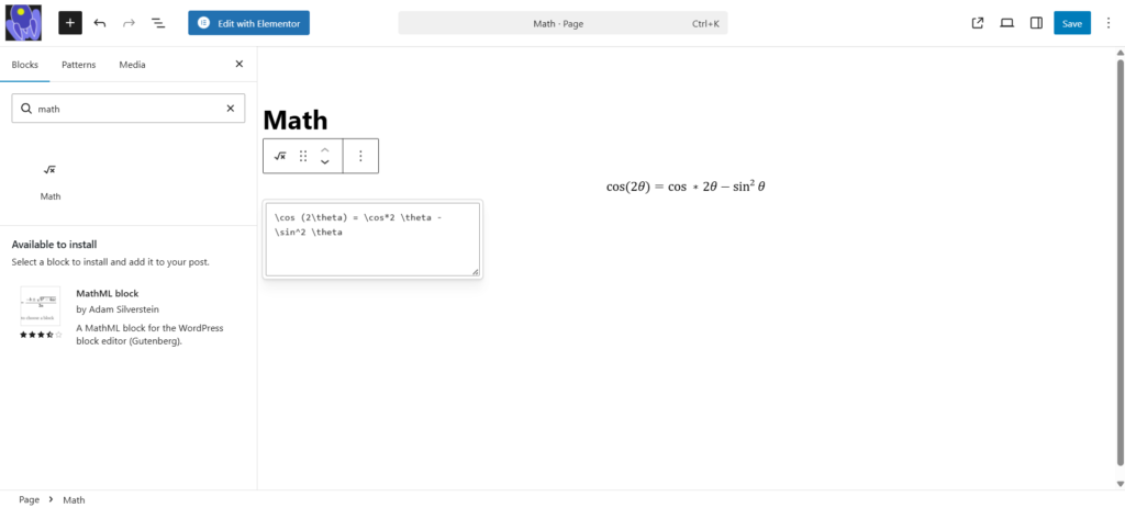 The Math Block allws you to insert mathematical formulas in content. Just write in LaTeX, and WordPress renders it automatically.