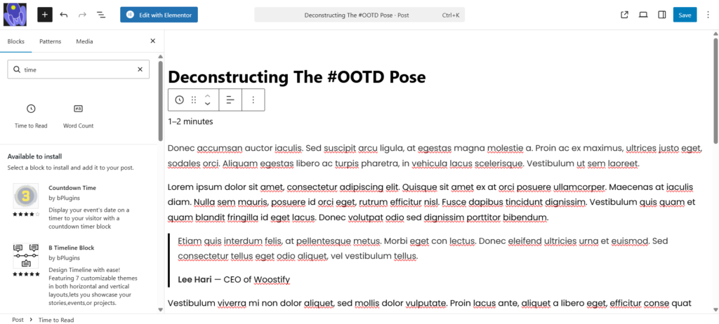 This block displays the estimated reading time for the current post or page.